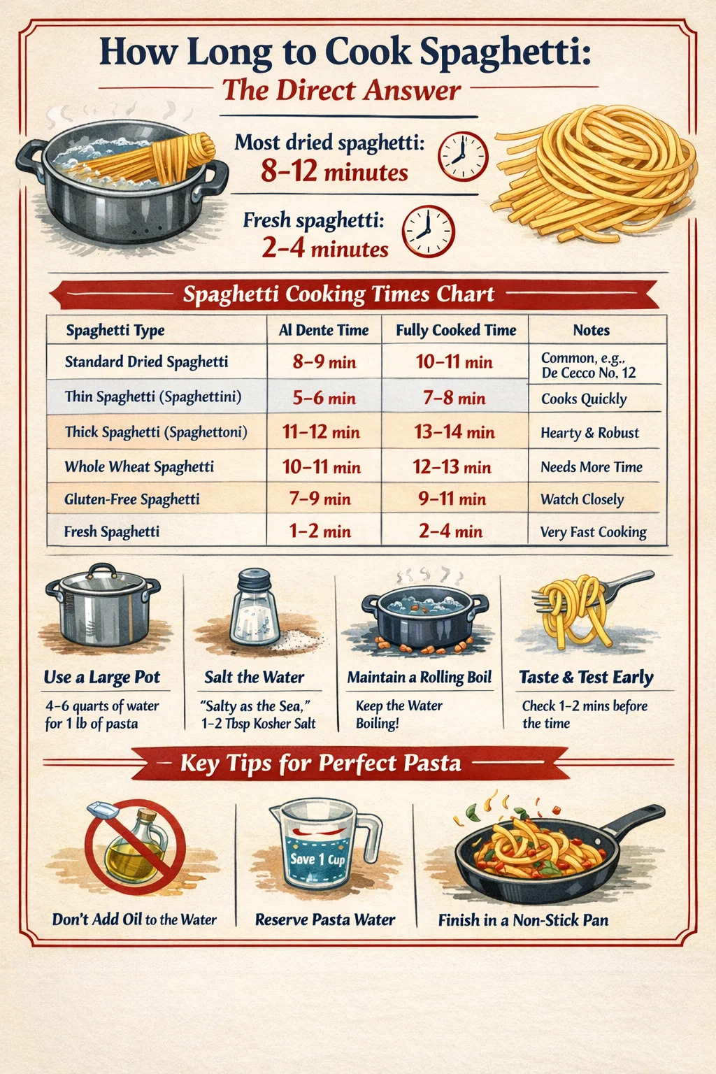 Больше всего сушеных спагетти от 8 до 12 минут готовить в кипящей подсоленной воде, в зависимости от толщины и предпочитаемой вами текстуры. Для приготовления аль денте — золотого стандарта итальянской кухни — стремитесь к нижней границе диапазона упаковки, обычно около 8–9 минут. Свежие спагетти готовятся намного быстрее, обычно всего за от 2 до 4 минут . Спагетти из цельнозерновой муки часто требуют целых 10–12 минут, чтобы размягчиться и не стать липкими.