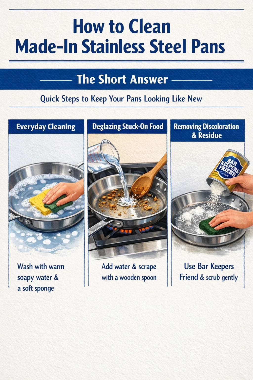Bar Keepers Friend (BKF) широко считается лучшим коммерческим чистящим средством для посуды из нержавеющей стали. , и Made-In явно рекомендует его для своих сковородок. Его активным ингредиентом является щавелевая кислота, которая растворяет ржавчину, минеральные отложения и обесцвечивание, не повреждая слой оксида хрома, защищающий поверхность. Вот как правильно его использовать: