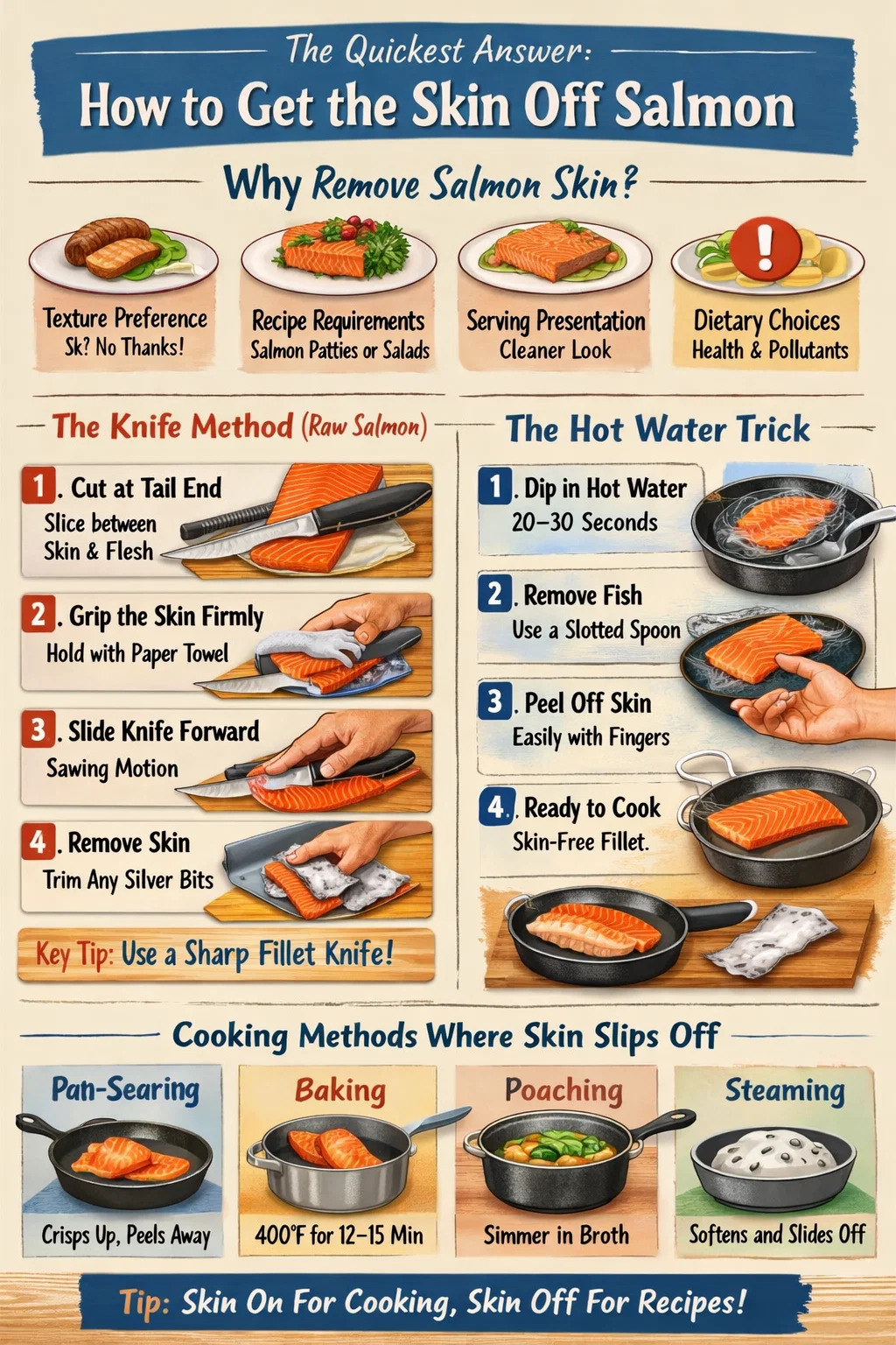 В этом руководстве описаны все практические подходы, в том числе техника работы с ножом, трюки с кипячением воды, методы приготовления, при которых кожа сразу соскальзывает, и как правильно кастрюли и сковородки может вообще исключить необходимость снимать шкуру с лосося перед приготовлением.