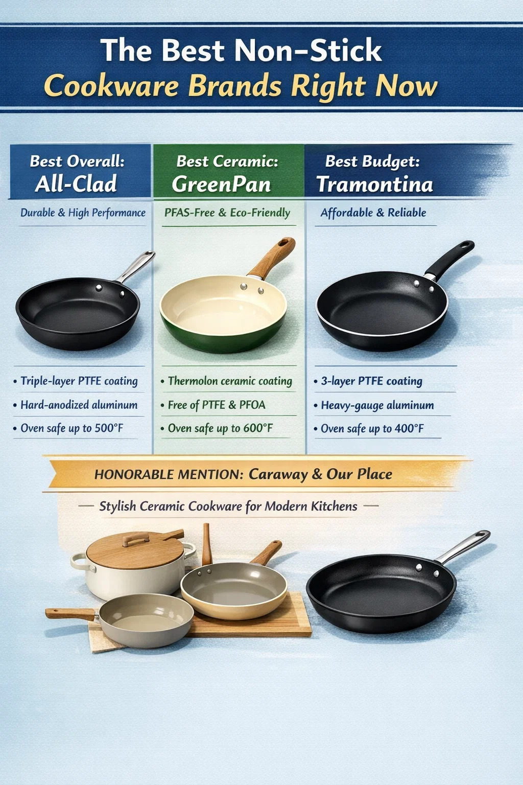 | GreenPan | Керамика (Термолон) | 40–120 долларов США | До 600°F | Выберите модели | Экологичные повара, не содержащие ПФАС |